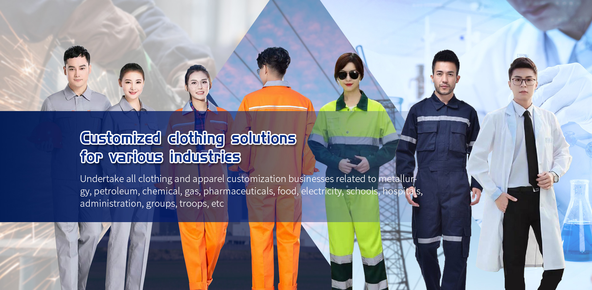 We mainly undertake all clothing and clothing customization businesses related to smelting, petroleum, chemical, gas, pharmaceuticals, food, electricity, schools, hospitals, administration, groups, troops, and other related industries, as well as processing with drawings, samples, and materials